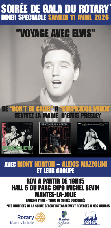 Le Rotary Club de Mantes-la-Jolie vous invite à une soirée de gala exceptionnelle, mêlant dîner de prestige et spectacle musical, au cœur d’un hommage vibrant à Elvis Presley.